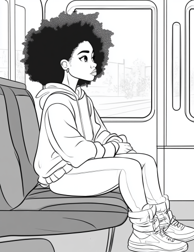 Illustrate a black and white coloring page that showcases a black woman in an urban setting, reflecting the diversity and energy of the city --v 5.0 --s 250