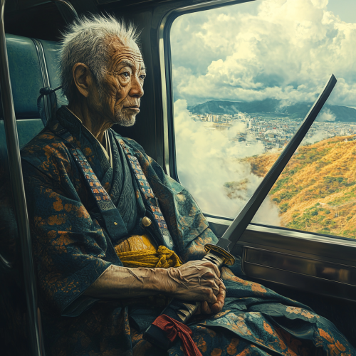 The samurai is seated on a modern Japanese bullet train, his weathered hands resting on his katana as he gazes out the window at the rapidly passing landscape. The sleek, futuristic interior of the train contrasts sharply with his ancient appearance. His expression could reflect a mix of wonder and melancholy as he tries to process the speed and efficiency of modern travel.