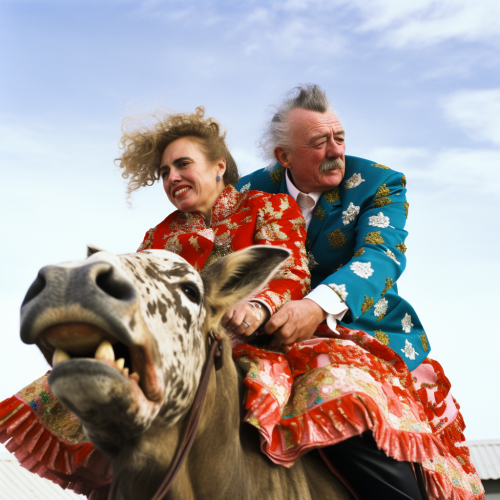 Martin parr photo of a loving couple made of women riding a hairy bull