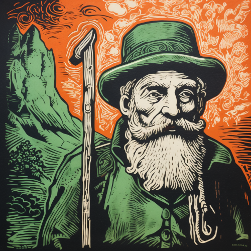 a black and white lubki russian style woodblock print, folk art, clean lines, of a wizard in the forest