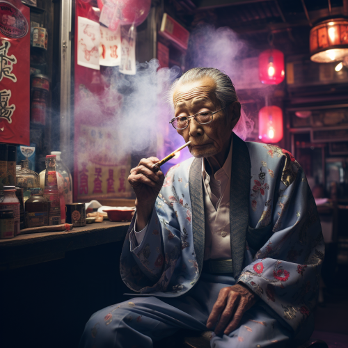 photography of 95 years old cyberpunk oyabun, subtle cybernetic implants, smoking cigar, dressed in kimono old dark restaurant in background