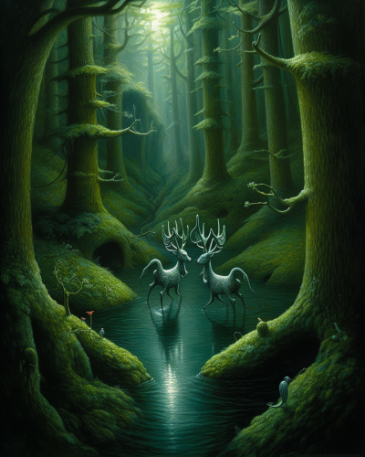 A pair of benevolent forest spirits, resembling deer with ethereal antlers, emerge from the depths of a magical, luminescent forest, welcoming travelers with grace and wonder, trapped emotions depicted, action shot, by Leonora Carrington, impasto oil painting, extra thick dubs --v 5a --ar 4:5 --c 20