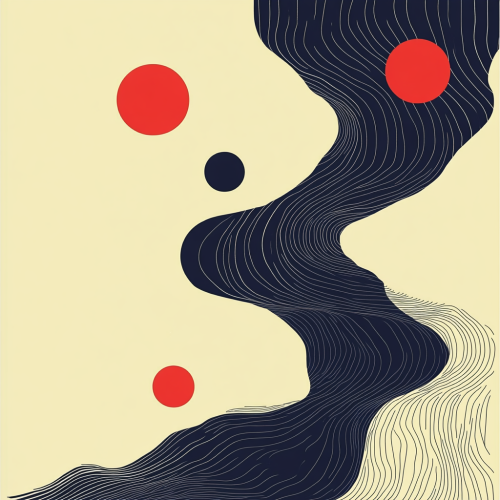a minimal liquid, wavy art poster and some wavy circles in the colors red and blue, in the style of reimagined classical forms, light yellow and red, carpetpunk, dissolving, playful lines, japanese-inspired imagery, melting