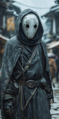 Japanese style specter, oddly shaped mask, sideways, eerie, live action, from the waist up, village, blurred background, ashy background --ar 1:2 --v 6.0 --s 500
