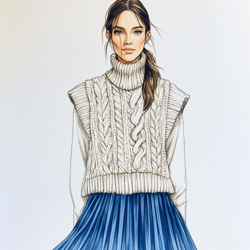 a fashion sketch of a woman wearing a oversized cable knit vest. Under the vest is a sleeveless turtle neck. Make the model wearing a blue pleated skirt.