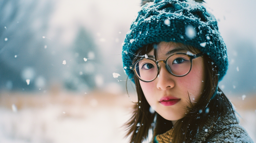 A japanese girl wearing a blue knit hat and glasses in a snow field. slightly apricot colored ,Kodak chrome pro-mist filter,seed 2115731575 --ar 16:9 --v 6.0