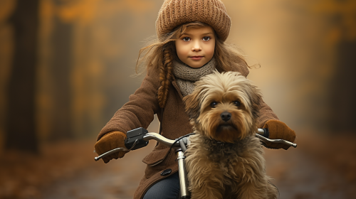 the little girl in a knit hat rides a bike with her dog, digital photography, wimmelbilder, 32k uhd, portrait miniatures, dusseldorf school of photography, earthy tones, contest winner --ar 16:9 --v 5.2