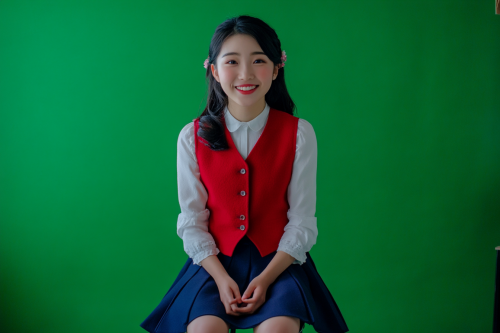 A young Japanese woman in her early twenties with a charming smile, dressed in a navy blue blazer, red skirt, and a white blouse, sitting on an iron stool with her feet clearly visible. The green screen background enhances the subject. Canon EOS R5 settings, full-body frontal perspective, hd quality, natural lighting --ar 128:85 --v 6.1
