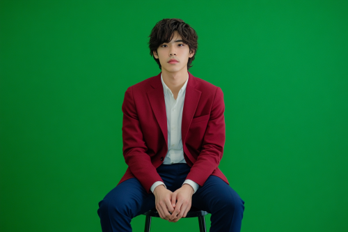 A Japanese male in his twenties, wearing navy blue trousers and a red blazer with a white shirt underneath, sitting on an iron stool, facing the camera head-on. He has a fresh and pleasant appearance, with short hair, slightly curly long bangs, thin eyebrows without makeup, and eyes open with a closed mouth. The background is a complete green screen, captured from a frontal perspective using Canon EOS R5 cameras, hd quality, natural look --ar 128:85 --v 6.1