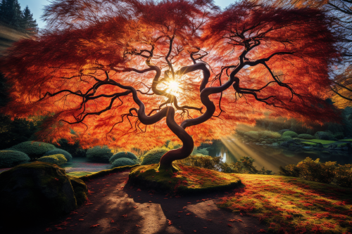 A lush beautiful Japanese maple tree with brilliant red and gold autumn leaves at Portland Japanese Garden with sunlight sneaking through the leaves. --ar 3:2 --s 250