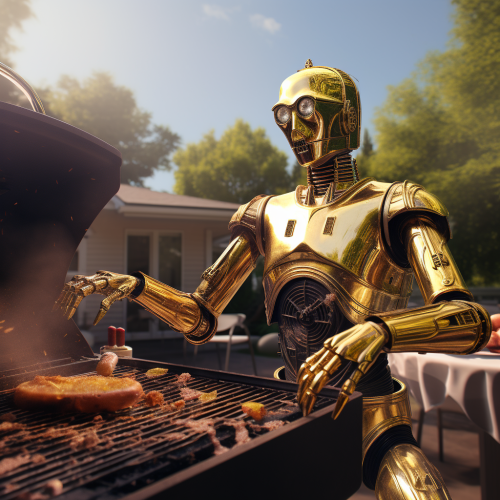 a mascot logo of an American bison standing on its back legs grilling steak over a round charcoal grill, hard edge painting, simple flat vector, barn red, yellow and green colors --no text, realistic photo details