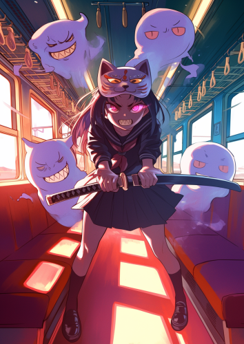 Japanese Cartoon Art Style, Funny but Scary, Upper Torso Only No Legs Ghost Japanese School Girl, Floating Head, Arms, Torso Only, Legs Missing, with a long Katana, Teke Teke, Background interior of a Bullet Train Car, --ar 5:7 --niji 6