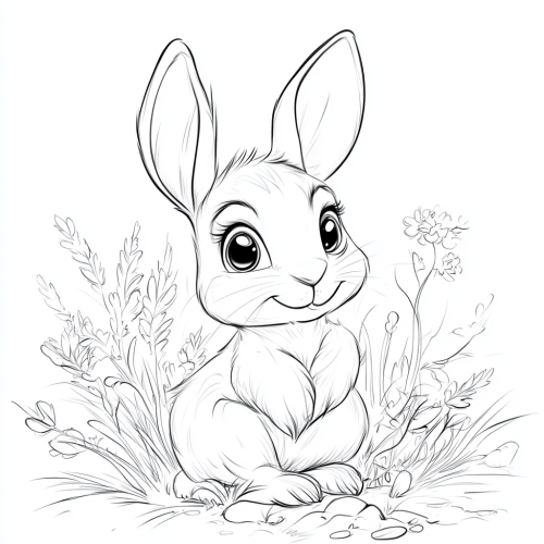 coloring page for kids, a cute rabbit ,cartoon style, thick lines, low detail,no shading ,Dreamlike, Art style in the manner of a disney film , bright image.