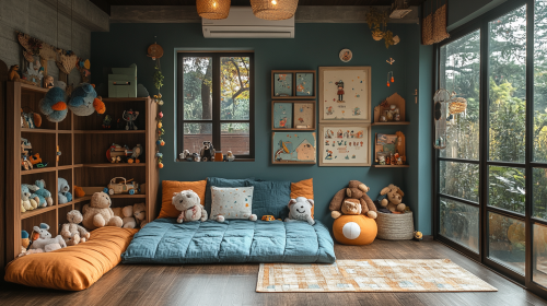 A little boy posing next to the gray cabinet with white shelves and inside. Next to her is an empty space for a picture or text on one of them. The cabinet stands in front of a wall decorated with hanging from wooden shelves. On top of it, there's some soft fabric. In the background, you can see other furniture such as boxes, shoes, and various accessories. It creates a cozy atmosphere and makes us imagine that we could place something related to kids' fashion here. --ar 87:38