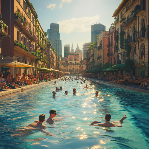 What Milan looks like, fascinating, 2024s, imaginative, realistic, photographic of the city of Milan, background Milan city view, incredible, creative, sea 3d render, city lights, young beautiful and handsome Italian people swimming, sunshine