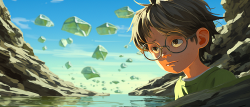 a kid with glasses on found a green sea slug in a rock pool, anime, 2D, comic, moebius, cinematic, moody, --ar 7:3 --s 50