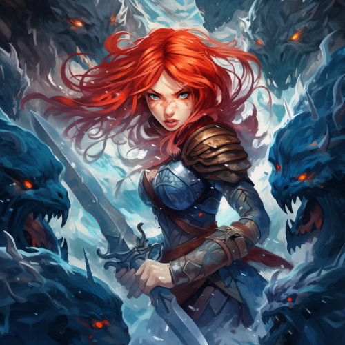 grim clan warrior goddess with red dyed hair, blue tatoos and a bronze sword is fighting furiously against a gang of ice demons, fantasy illustration