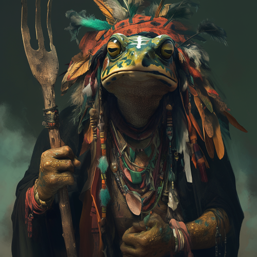 Portrait of an Frog supernatural shaman during the 1970s holding voodoo items and totems, white painted fork on forehead Photorealistic --niji 6