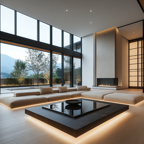 Design a spacious and elegant living room that embodies the essence of Japanese minimalism with an ultra-luxury twist. The room features an open-concept layout with expansive floor-to-ceiling windows, offering unobstructed views of a tranquil Japanese garden and the distant mountains. The minimalist aesthetic is enhanced by natural materials, warm lighting, and seamless transitions between indoor and outdoor spaces. The flooring is made of pale, smooth oak wood with a matte finish, adding warmth without overpowering the simplicity. A low, square, dark stone fireplace is recessed into the floor at the center of the room, blending effortlessly into the design and serving as a central gathering point. Above, the ceiling is high and features sleek wooden beams running horizontally, enhancing the sense of openness and continuity. Furnishings are kept minimal, with a large, modular sofa in neutral beige tones made from plush, high-quality fabric, positioned to face the panoramic views. A single, low, black-lacquered coffee table with a glass top sits in the middle, its surface adorned with an elegant Ikebana arrangement, reflecting the balance and serenity of Japanese design. The walls are finished in a smooth, off-white plaster, with one feature wall made from natural stone, adding texture and grounding the space. Soft, indirect lighting is concealed in the ceiling and along the floor-to-wall transitions, creating a calm, ambient glow. On one side of the room, a floating wooden staircase with glass railings leads to a mezzanine level, where a private reading nook overlooks the living area. Sliding shoji screens made from translucent paper and dark wood frame the entryways to adjacent rooms, maintaining the flow of light while offering the possibility of privacy. In a [...]