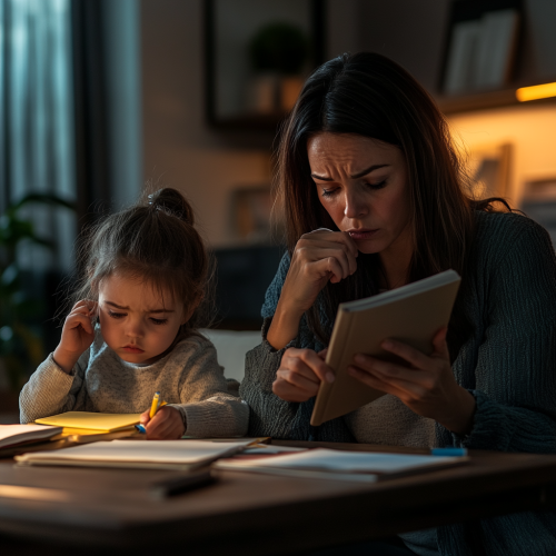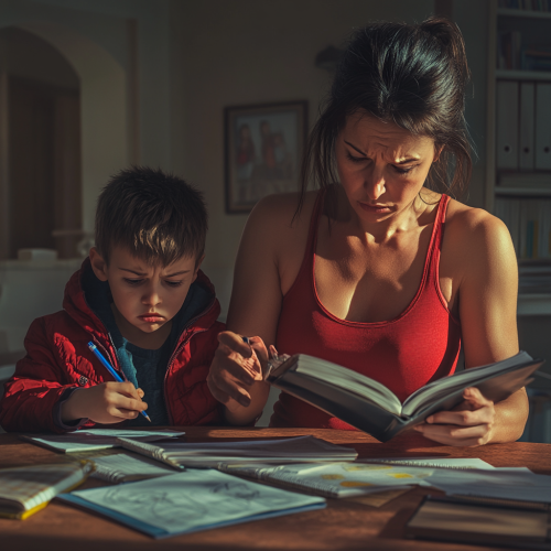 Mother in red sleeveless tank top doing homework with her child, frustrated expression, holding herea hd with both hands, child in jacket sitting at the table with school books, modern living room background, realistic photography, soft lighting