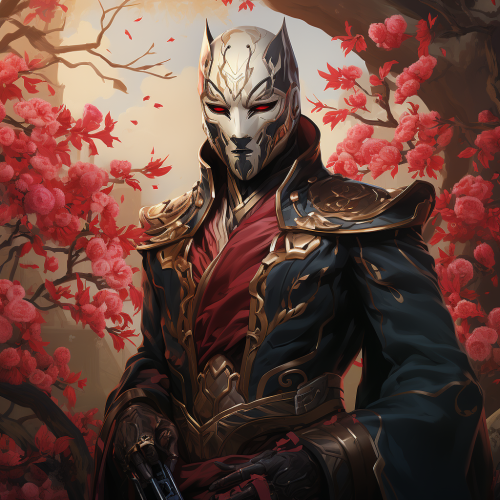 Jhin, the Virtuoso from League of Legends, in a Japanese-style setting. Jhin, exuding artistic precision and enigmatic charisma, stands facing the viewer with his meticulous firearm and ornate daggers at the ready. Position him within a captivating background that incorporates iconic Japanese stereotypes, such as a moonlit garden with cherry blossom trees, a serene koi pond, and traditional teahouse architecture. The image should capture Jhin's artistic and methodical nature within the tranquil and aesthetically rich culture of Japan. --seed 4222536721 --s 750
