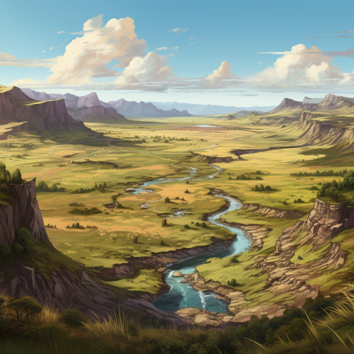 A beautiful landscap, cartoon style, composed of 3 parts, the first part is a big grassland with green gradients, the second is a lake with blue gradients and the last one is a volcano with red gradients --ar 4:3
