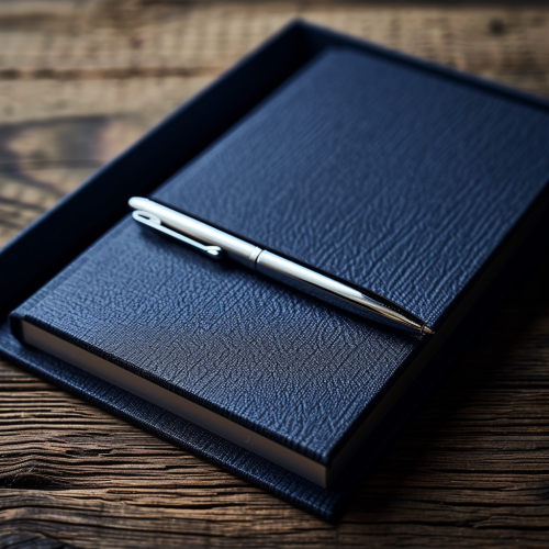 Product, luxury stationery set, A5 notebook, deep blue textured cover, silver pen, high-quality paper, elegant presentation box, wooden desk background, soft overhead lighting, focus on the texture of the materials, macro lens, commercial photography style. --v 6.0