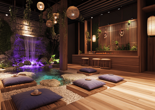 Japanese tea house with wooden interior, warmly lit, soft subtle purple blue and green lighting, ambient environment, psychedelic mushroom motifs, there are cushions on the floor and short tables. There are hanging plants inside of floating crystal pots. Relaxing and tranquil environment with a wooden tea bar on the back wall . water fountain as the central focus of the room. --ar 7:5