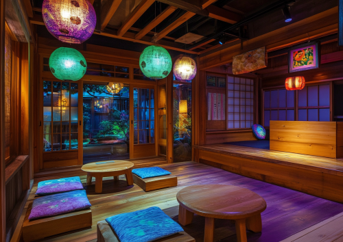 Japanese tea house with wooden interior, soft purple blue and green neon lighting, ambient environment, Mushroom motifs, moon-shaped glowing sign on the wall, there are cushions on the floor and short tables. Relaxing and tranquil environment --ar 7:5