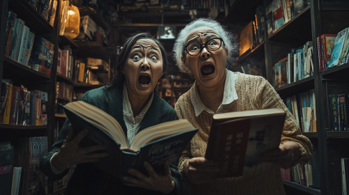 a commercial photo of a 40 years old hong kong zombie couple yelling to their customers at a dramatic lighting book store with 10 clients, cinematic photography, --ar 16:9 --v 6.1