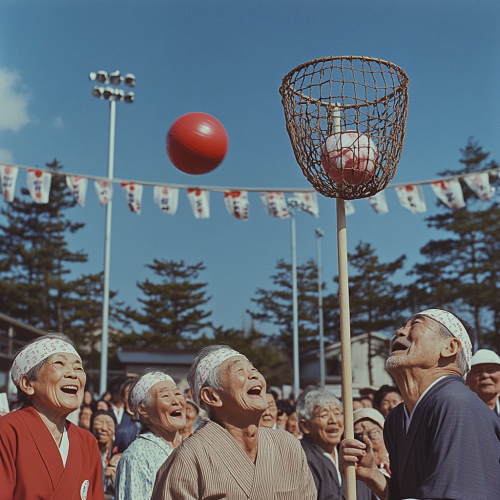 A dynamic scene at a Japanese sports day (undokai) featuring elderly men and women (grandpas and grandmas) excitedly participating in a traditional ‘Tamaire’ (ball-tossing) competition. One of the red or white balls is shown hitting and landing inside the visible tall basket mounted on a pole. The elderly participants, wearing sportswear, headbands, and some in traditional Japanese attire such as yukata, are joyfully engaged in the game. The outdoor setting is a bright, sunny day, with a track field in the background, decorated with banners and flags. Spectators are cheering them on, adding to the lively and festive atmosphere