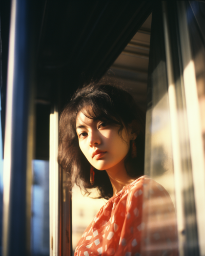 shot through the window, a Japanese woman in fashionable clothing, early 20s, red and blue, in the morning, sunlight on the street, cinematic lighting, depth of field, beige tone, off white, overcast, shot with Kodak disposable camera, 70s film colours, realistic, 8k, --v 5.2 --style raw --ar 4:5