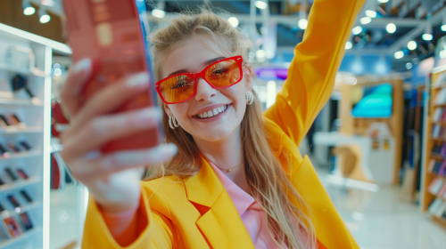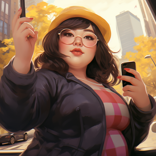 She is a slightly chubby Japanese. She is taking a selfie in a fashionable city.
