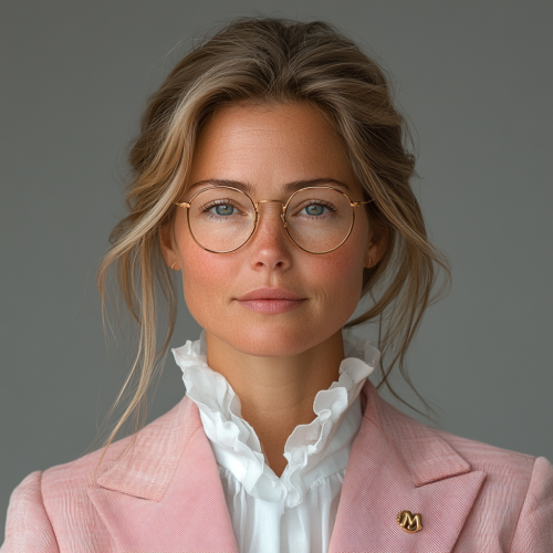 A realistic portrait of a 45-year-old woman with natural features, minimal makeup, wearing a pink suit jacket with a white blouse underneath and a discreet brooch with an ‘M’ on it. She is also wearing premium Prada eyeglasses, adding a sophisticated touch to her look. Her expression is calm and confident, with detailed skin texture and natural lighting. Background should be simple and unobtrusive. --s 250 --style raw