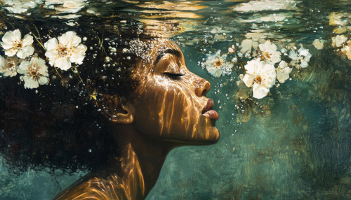a Brazilian woman in profile, half her head underwater, eyes out of water, with flowers growing up out of the water casting shadows, in oil painting style --ar 114:65