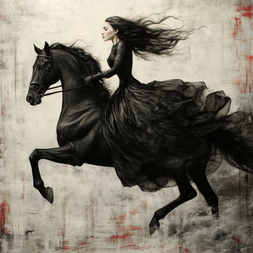 Please create a detailed and nuanced image in Eadweard Muybridge style, where a black horse seems to be moving forward galloping , and a beautiful very pale woman is running beside, the horse has a perfect coat, the woman has long hair and red lips, black and white artwork, merging classic oil painting with digital features, fine art with flickering red and blue neon details