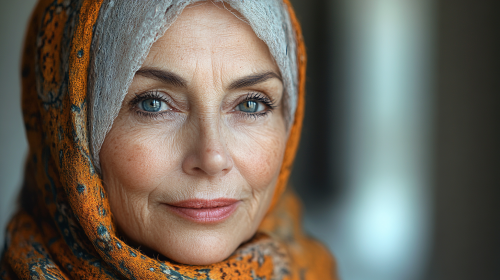 full shot for a A realistic portrait of a arabic old woman,The background is clean and white, giving the image a professional studio feel. The lighting is soft, features naturally. --ar 16:9 --s 750