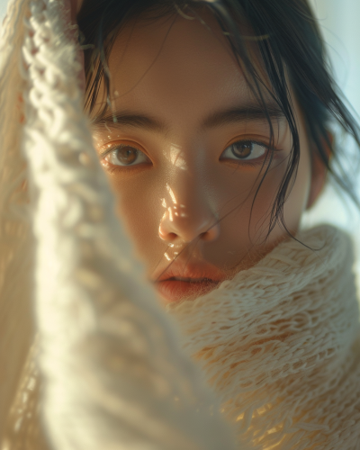 Highly detailed 4K close-up of a Japanese girl wearing a white chiffon long cardigan, soft and flowy texture, looking into the camera. Background subtly blurred to bring focus to her and the garment. Warm lighting enhances the fabric’s delicate layers and her natural features, magazine style, Canon EOS R5, professional clarity --ar 4:5 --v 6.0