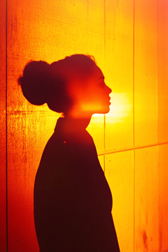woman silhouetted against an orange light, in the style of 1960s, yellow and red, tonal contrast, two tones, bold fashion photography, silkscreening, 35mm film texture, high noise --style raw --ar 2:3 --v 6.1