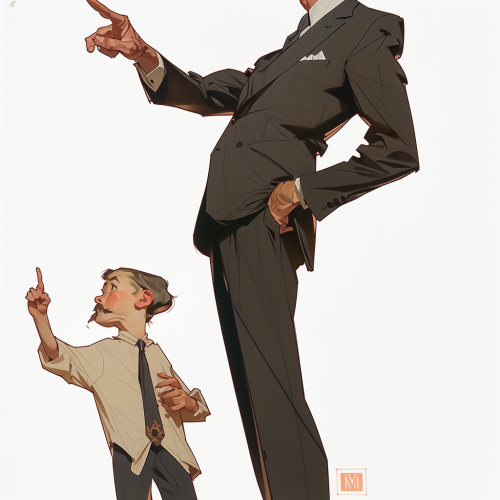 a poster illustrated by JC Leyendecker depicting an attractive tall man wearing a suit walking and holding the hand of his young son next to him as he points out something in the distance --s 250 --niji 5 --style expressive