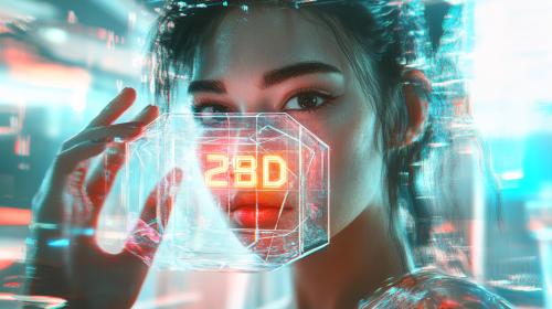 draw very attractive woman holding a 3D tesseract with the words DJ 2BaD inside. The effects should be bright, layered, futuristic --ar 16:9 --style raw --v 6.1