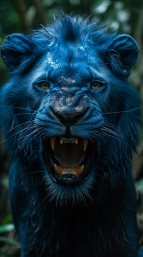 a real lion with intricate bluish skin features, light indigo and black stripes, growling fiercely in the rainforest --ar 9:16 --s 250 --v 6.0