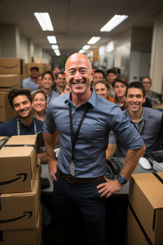 Jezz Bezus, a founder of amzaon, in amazon head office, with his happy employees and customers, hyper realistic image, HD, --ar 2:3 --s 750