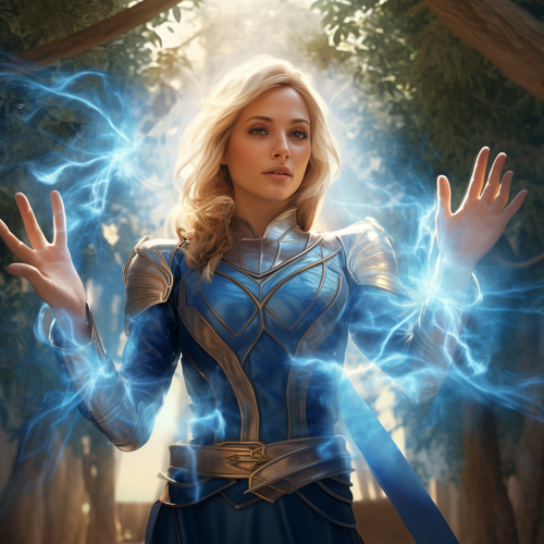 byzantine art blonde woman sorcerer in blue armor outside arms outstretched with wild magic emanating from palms in agrarian setting facing forward