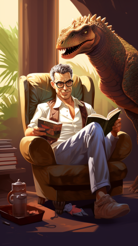 Jeff Goldblum tries to read a book while a dinosaur tries to stop him. --ar 9:16