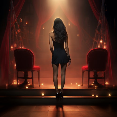Yor Forger, View from beneath, high heels, anime art style, stockings, a black-haired girl with red eyes sitting on the sofa, legs crossed, in a dark room, low-angle shot, shiny, glossy skin, anime-style face, anime-inspired pose, beautiful hands and feet. --ar 3:4 --niji 6