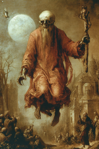 A Van Gogh painting of Saint Jerome deeply focused, pen in hand, with a skull and scriptures nearby, bathed in dramatic light that highlights his aged face and contemplative expression.