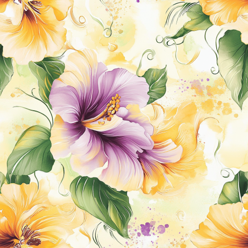 closeup seamless floral pattern. consisting of: tropical flowers. basic delicate colors: yellow, lilac, green. the drawing has an abstract shape, fancy curls, and splashes of white outline. The drawing is made in watercolor. Special attention is paid to details, the drawing should look expensive. reminiscent of Jiang Debin style. silk texture. --tile --v 6.1
