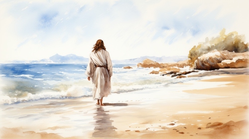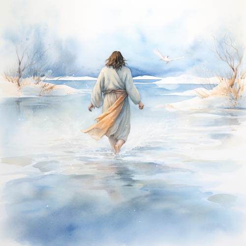 a chilren's storybook watercolor style painting of jesus walking on frozen water