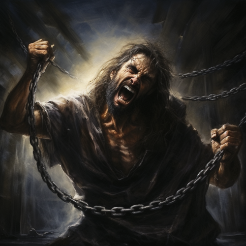 jesus, angry, hunt scene, darkness, chain, aggressive